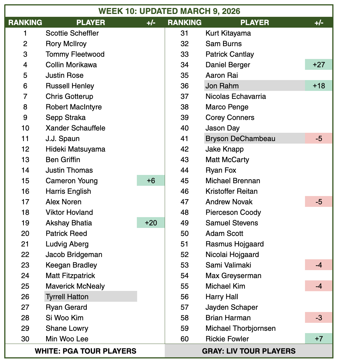 OFFICIAL WORLD GOLF RANKINGS: TOP 60