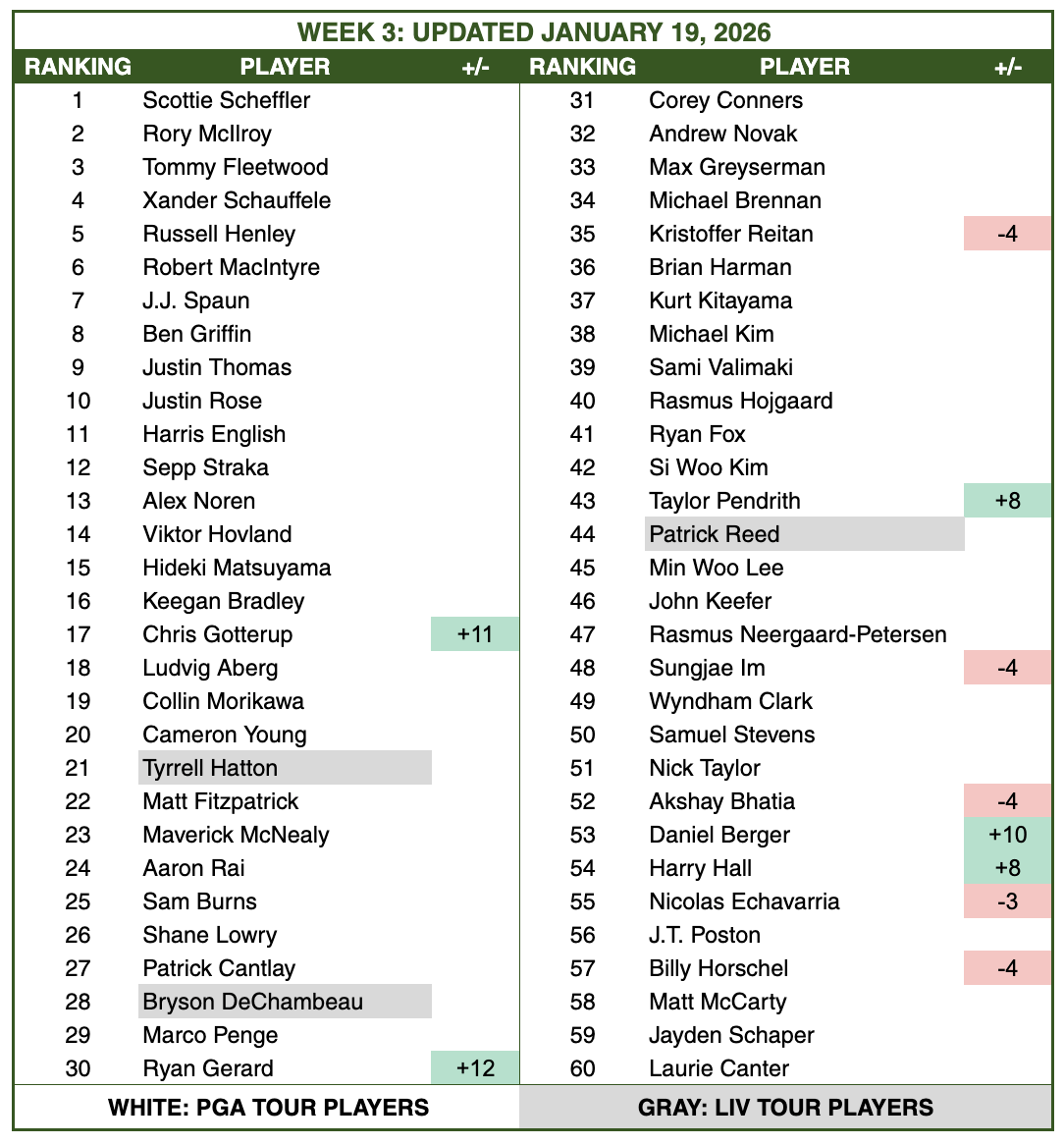 OFFICIAL WORLD GOLF RANKINGS: TOP 60